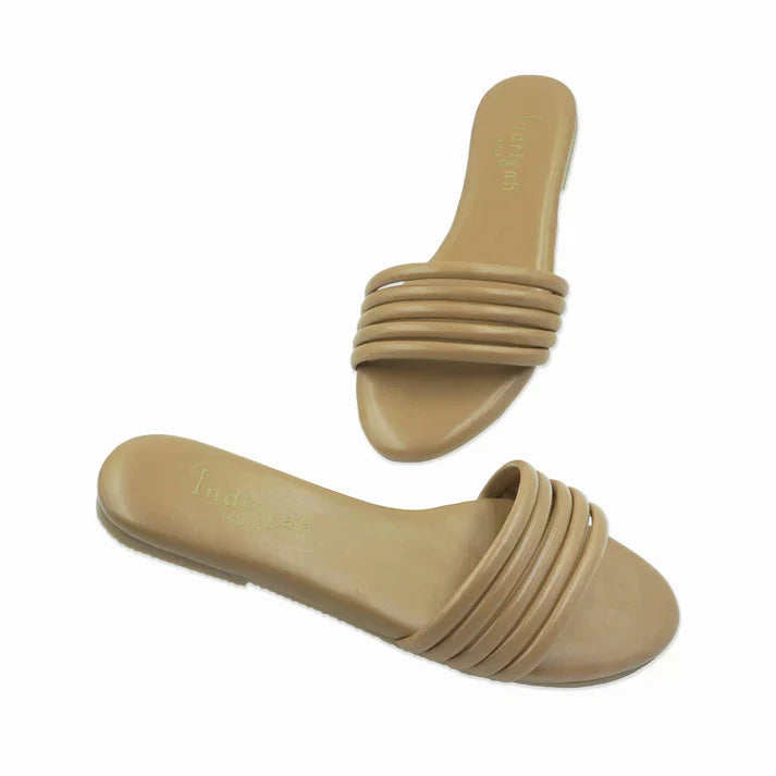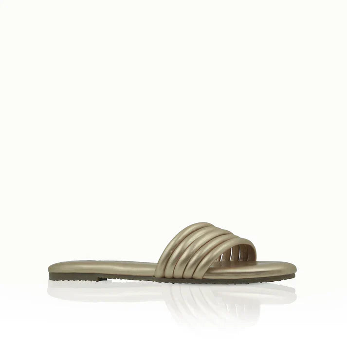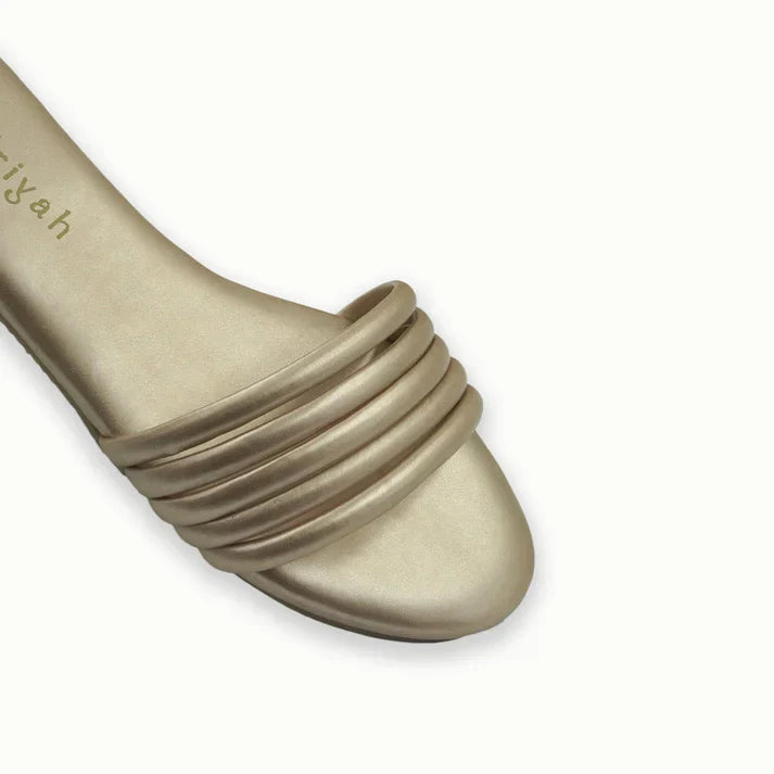 Discover the elegance of our Amelia gold sandals, where muted antique gold faux leather meets fashion-forward strap detail. A harmonious blend of sophistication and ease, perfect for every event.