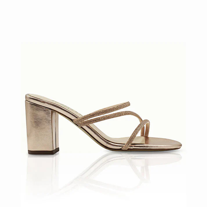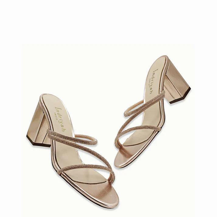 Discover the elegance of our Amelia gold sandals, where muted antique gold faux leather meets fashion-forward strap detail. A harmonious blend of sophistication and ease, perfect for every event.